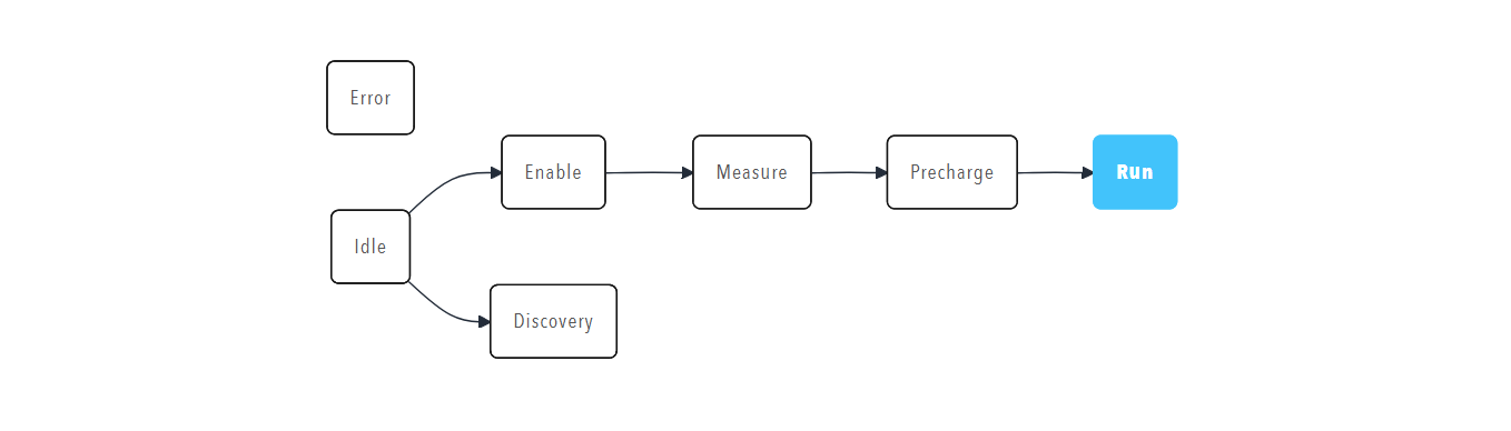 model: "flowchart LR\r\n\tERROR(Error)\r\n\tIDLE(Idle)\r\n\tENABLE(Enable)\r\n\tDISCOVERY(Discovery)\r\n\tMEASURE(Measure)\r\n\tPRECHARGE(Precharge)\r\n\tRUN(Run)\r\n\tIDLE --> ENABLE\r\n\tIDLE --> DISCOVERY\r\n\tENABLE --> MEASURE\r\n\tMEASURE --> PRECHARGE\r\n\tPRECHARGE --> RUN\r\n"
