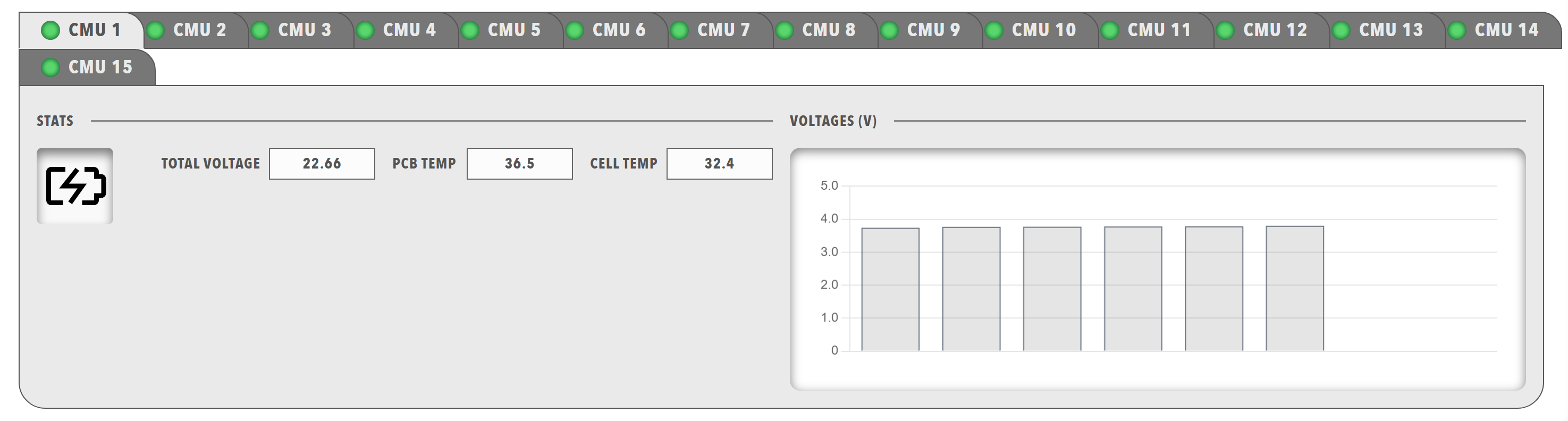 Tabbed interface with header lamps and body content. Tabs organize information into separate views, allowing users to switch between different data sets or views.
